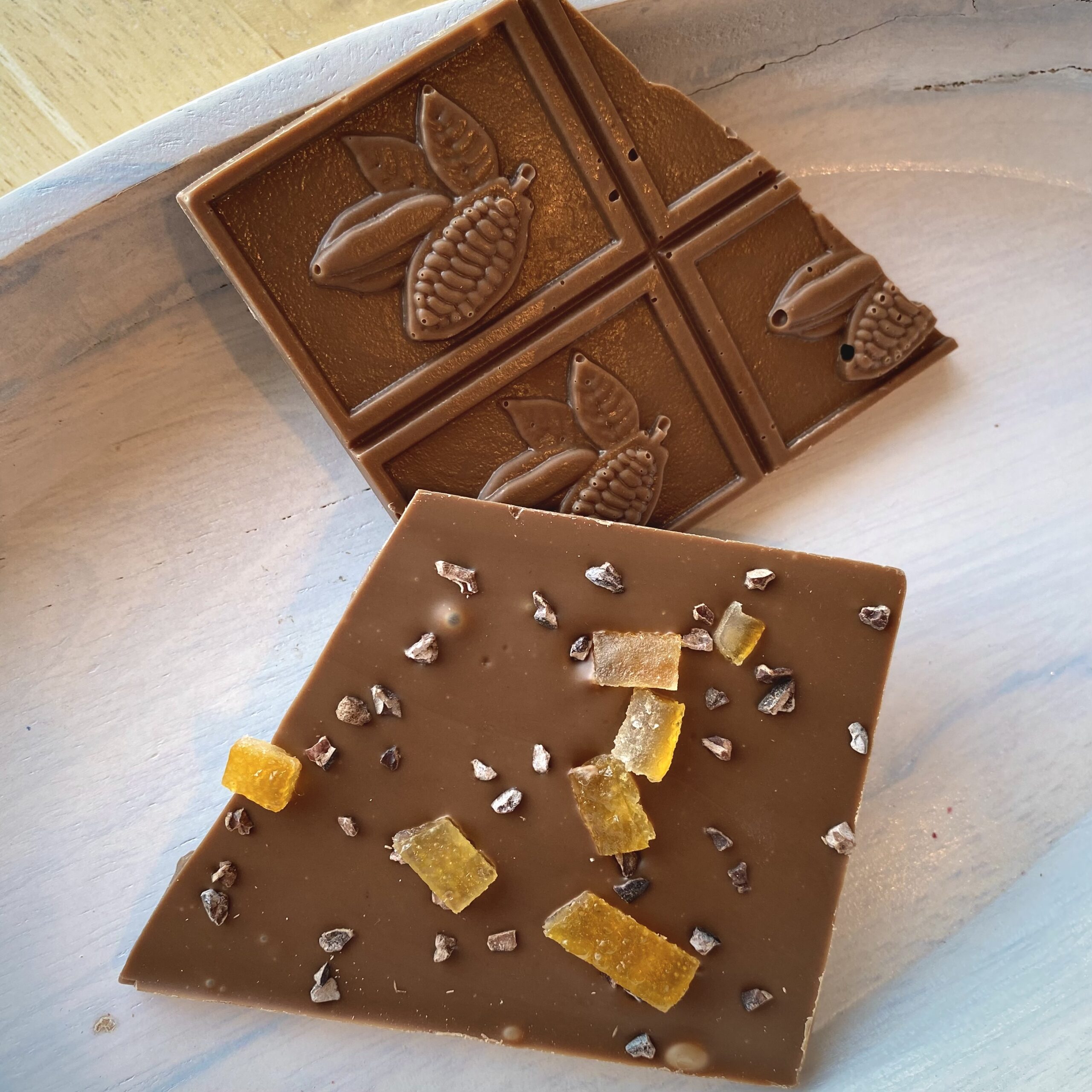 Milk Chocolate backed with candied orange pieces and cocoa nibs.